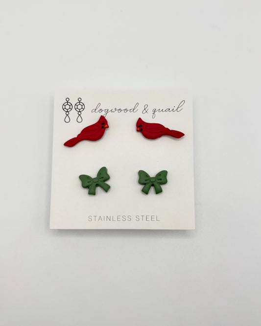 Christmas Cardinal & Bow Polymer Clay Stud Earrings