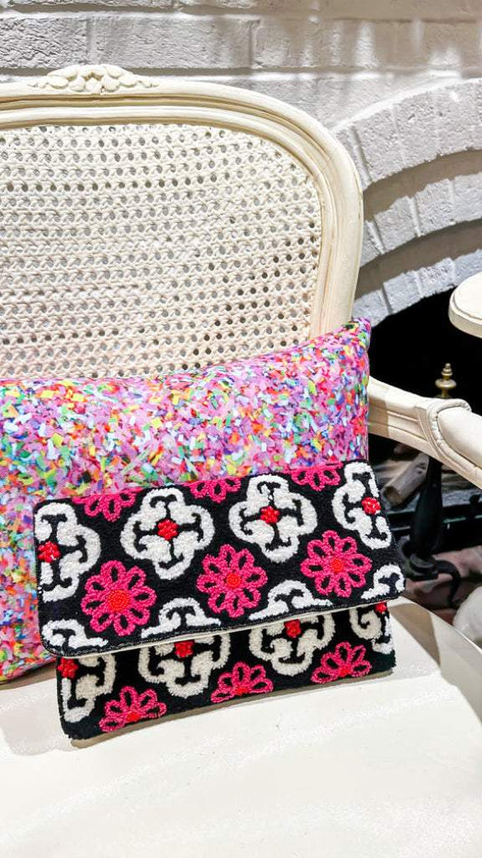 Jan Mod Latch Hook Seed Bead Clutch With Crossbody Chain