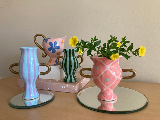 Description : Ceramic handmade vase with a light blue and lavender striped pattern and gold...