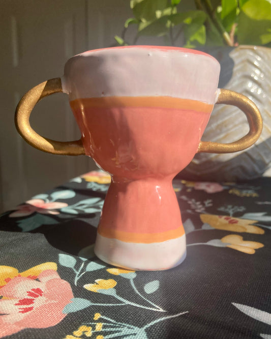 Description : Handmade ceramic vase with a grapefruit, white and tangerine striped glaze & gold...