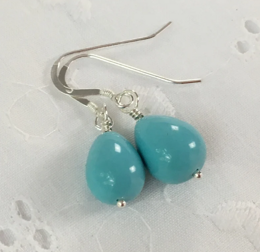 Description : Gorgeous turquoise blue teardrop shell pearls 12mm x 10mm, wire wrapped and dangling...
