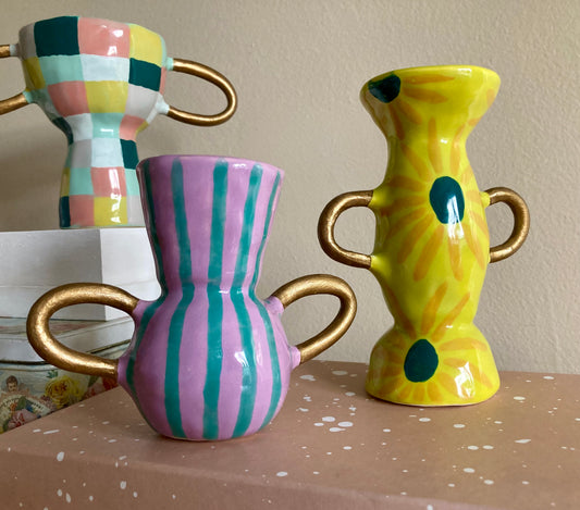 Description : Handmade ceramic vase with a purple and teal striped pattern and gold handles....