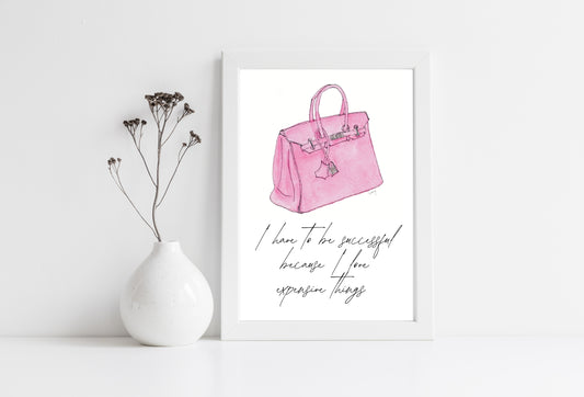 Description : Unframed 5”x7” art print on textured 110# paper. Print of bubblegum pink handbag...