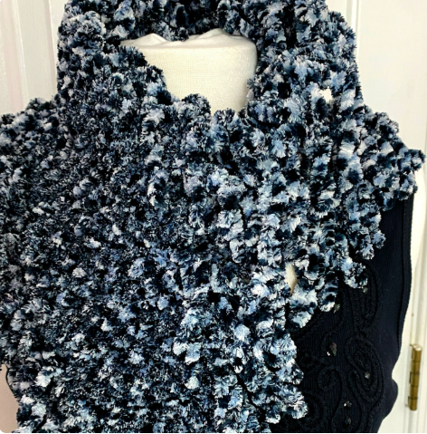 Description : This scarf is so soft and warm you will want to wear it every winter day - outside AND inside. 11" wide including luscious thick fringe 3-3.5" long on each side, and approximately 58 to 60" long. This scarf keeps you so warm you may want to go without your coat. Or wear it like a shawl around your shoulders. Machine washable. Cool temperature. Delicate cycle. I suggest using a mesh lingerie bag. Tumble dry at low heat. This scarf is ready to be yours today. Made with Patons yarn.