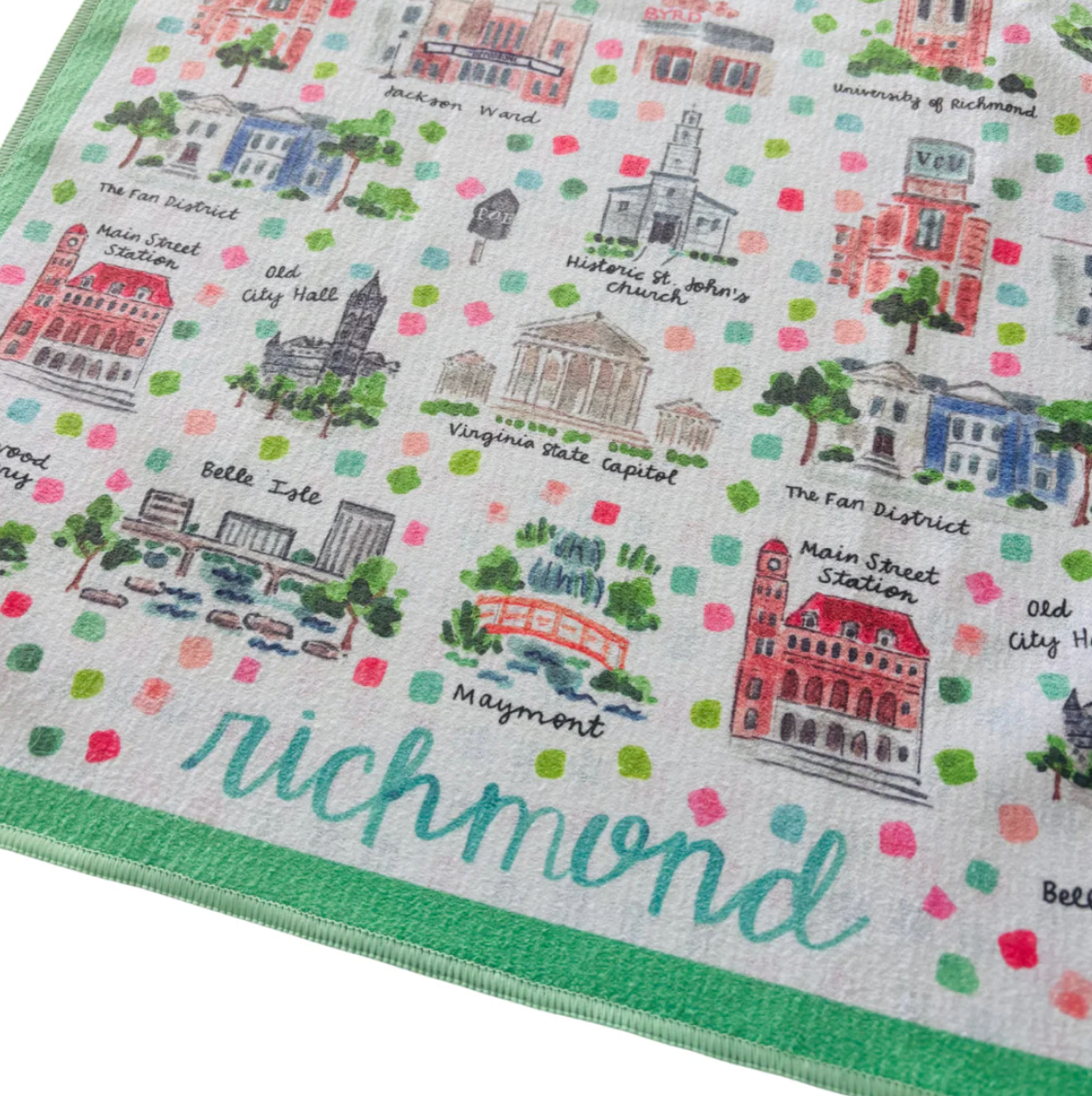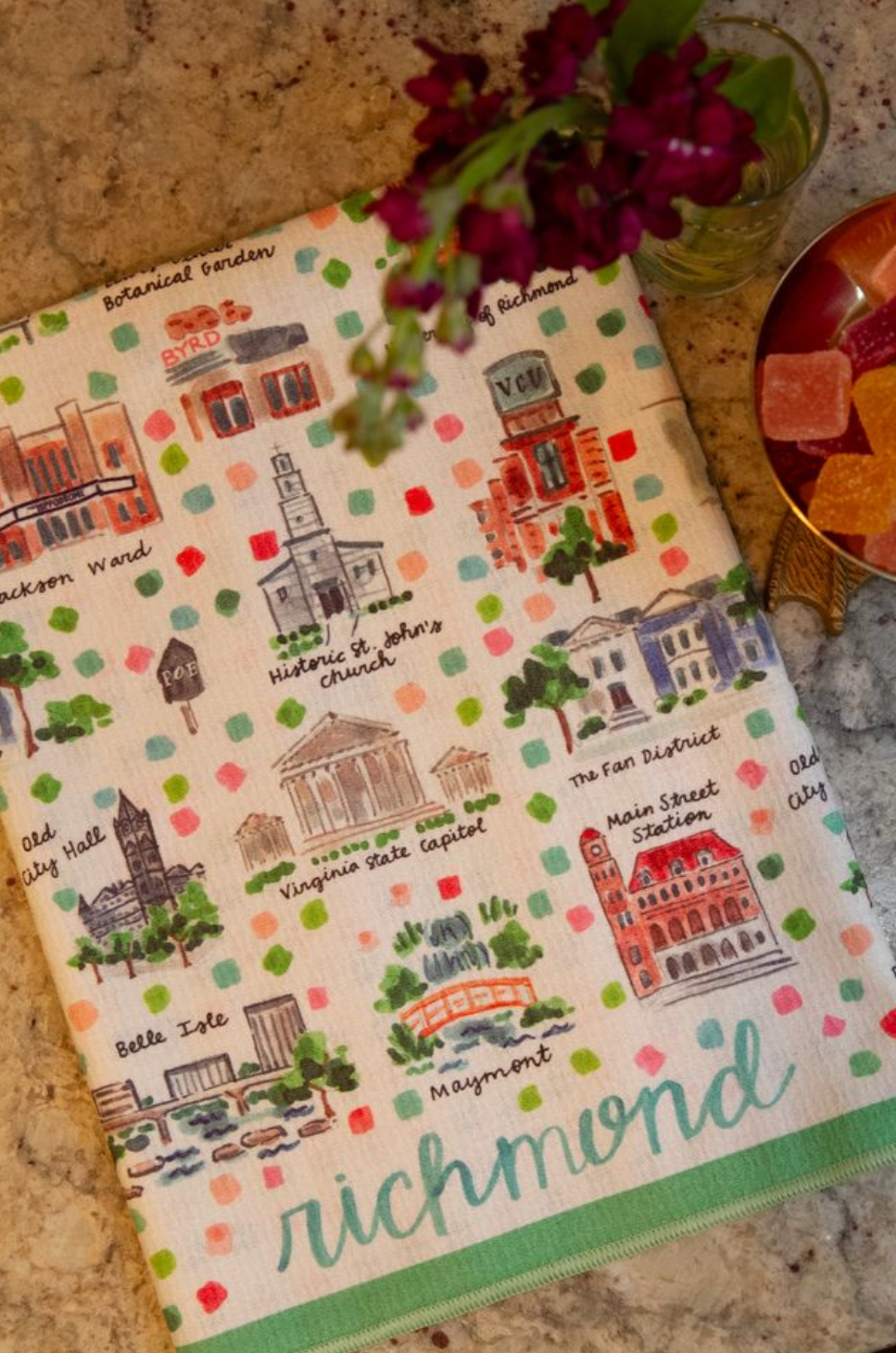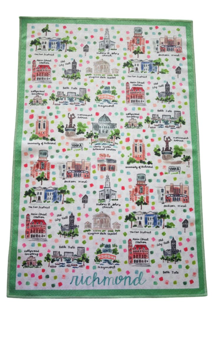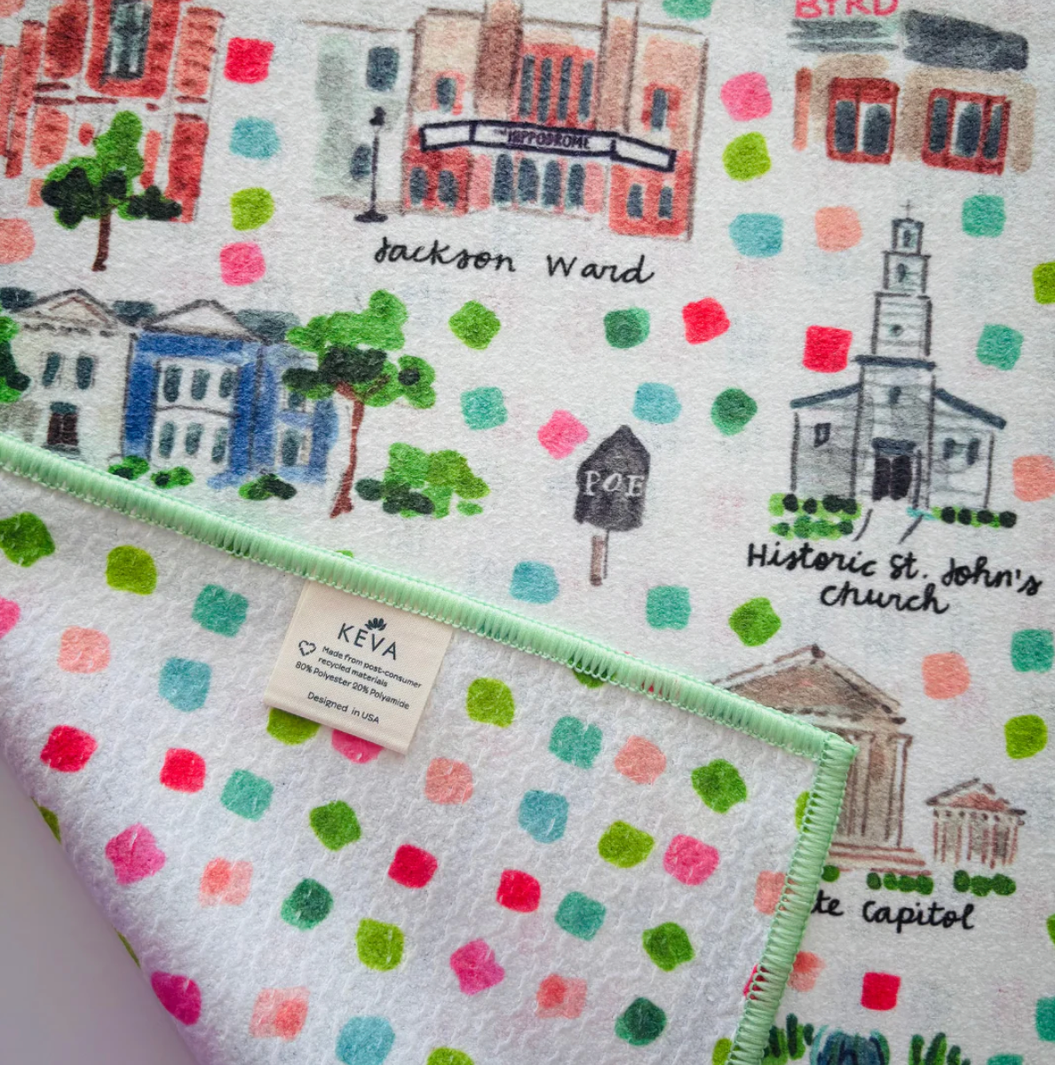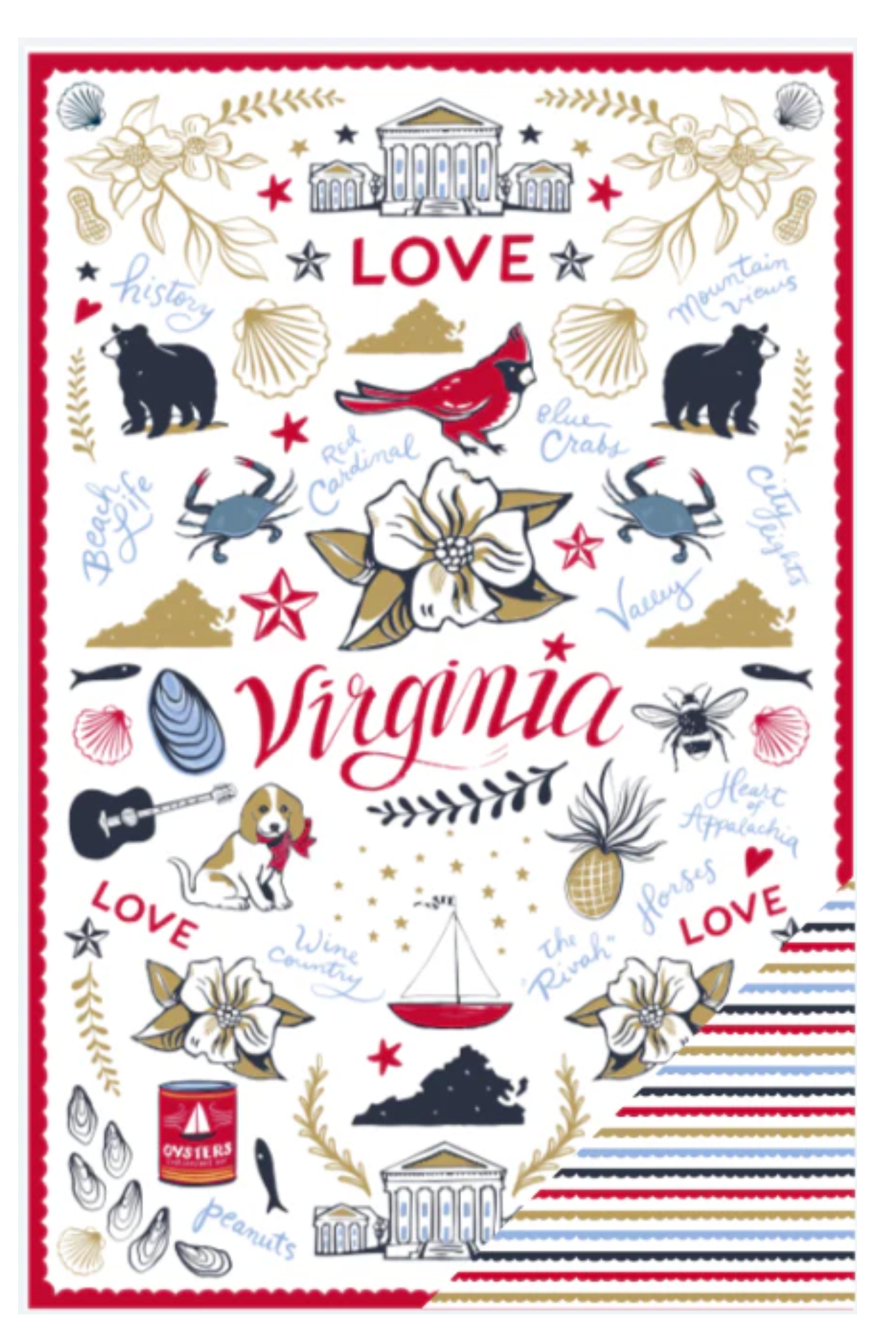 Description : Hometown Virginia Pride Double-Sided Tea Towel We love a good tea towel. Especially ones that are both absorbent and beautiful. Use in your kitchen, hang in your powder room, wrap around a bottle of wine and welcome this original art into your home. These towels are SUPER ABSORBENT (makes drying those dishes or hands fast), FAST DRYING (say goodbye to smelly towels) and feature ORIGINAL ART by our team of female artists - who each receive a % of sales with each purchase. We can't seem to keep this one in stock, so grab a few while you can! ORIGINAL ART by Laura Marr hand-drawn in her Richmond, VA studio. "My work is rooted in optimism; from finding a bird's nest to the color of a sunset, there. are little moments of beauty everyday." - Laura Marr Created By partners with female artists, turning their original art into goods to wear, use, give and love. Wave weave fabric Double-sided art 18” x 27” Machine wash cold, do not bleach Packaged ready to give with artist story included.