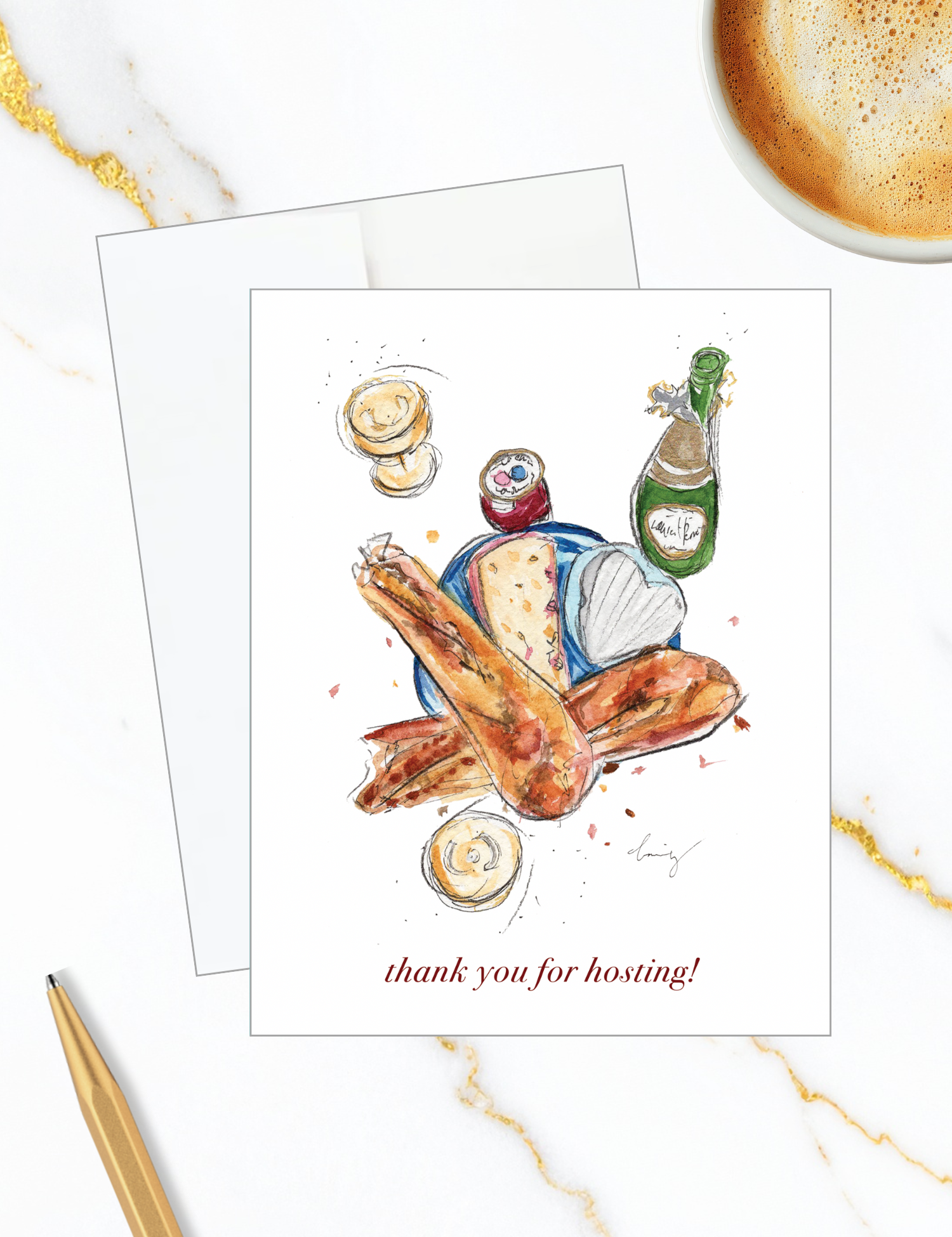 Description : Host thank you card featuring watercolor art of a casual tablescape from a Paris afternoon cheese, champagne, and baguette snack with text below it that reads "thank you for hosting!". Card is a sweet and petite A2 size (4.25" x 5.5"). Blank inside. White invitation-style envelope with square flap included. Packaged in a clear protective sleeve. Copyright © 2025 Channing Gibb Art.