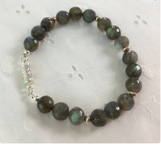 Description : Here's one lovely labradorite bracelet. A genuine gemstone beaded bracelet - these are yummy faceted round 8mm labradorite beads. Excellent quality beads! My camera only partially captured the sparkle and the blue flash of these beads. I have tried and tried... But I KNOW you'll be pleased! They are SOOOO pretty! Some beads seem almost translucent. I have separated the labradorite beads into groups of three, with small sterling silver rondelle beads in between. The bracelet is finished with a pretty, strong and sturdy magnetized clasp. The bracelet shown is 7-3/8" long. Fits my 6" wrist perfectly! Wear it alone, or stack it with other bracelets. Wear it to work, or with that little black dress, or with your favorite little tee shirt!
