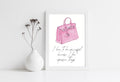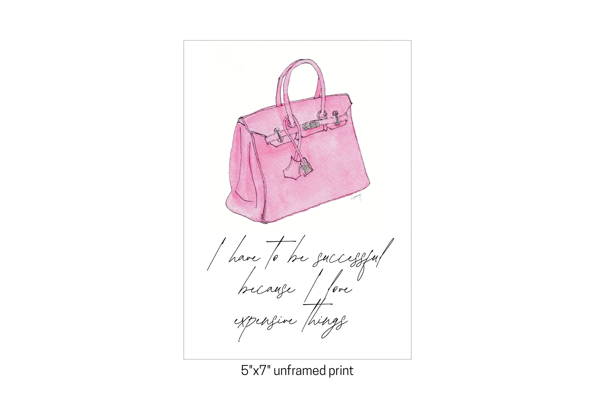 Description : Unframed 5”x7” art print on textured 110# paper. Print of bubblegum pink handbag with the text below that reads: "I have to be successful because I love expensive things." Art print made from original watercolor and Micron pen art by Channing Gibb. The print was designed and printed locally in Richmond, VA. Copyright © Channing Gibb Art. Prints may not be resold, redistributed, altered, or printed.