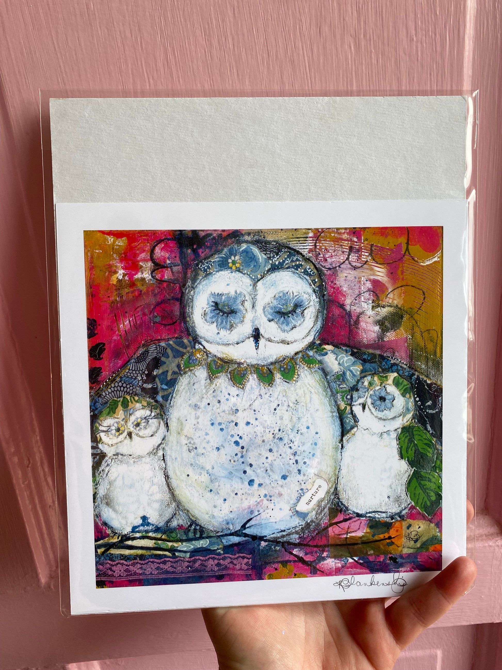 Description : 8x10 print of original mixed-media painting/collage Mother owl with 2 babies.