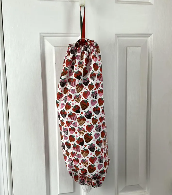 Description : Large plastic bag or trash bag holder, kitchen bag storage organization. This one is made in a pretty strawberry print! Organize and reuse your grocery and plastic bags with my pretty handmade bag holders. Large plastic bag or trash bag holders can be hung on a hook or a doorknob. These work great in the kitchen, bathroom, laundry room, garage, or anywhere else you might need to grab a plastic bag. Also suitable for use in the pantry, dorm, cabin, camper, beach house, lake house or powder room for storage or trash bag holders. I used elastic in the top and bottom, and added a loop for hanging the bag with a coordinating ribbon. These bags are made with 100% cotton fabric. The bags measure about 18" in length, and 9" in width, but since it is handmade the measurements may vary slightly. Machine wash cold, air dry low. Iron with low temp if needed.