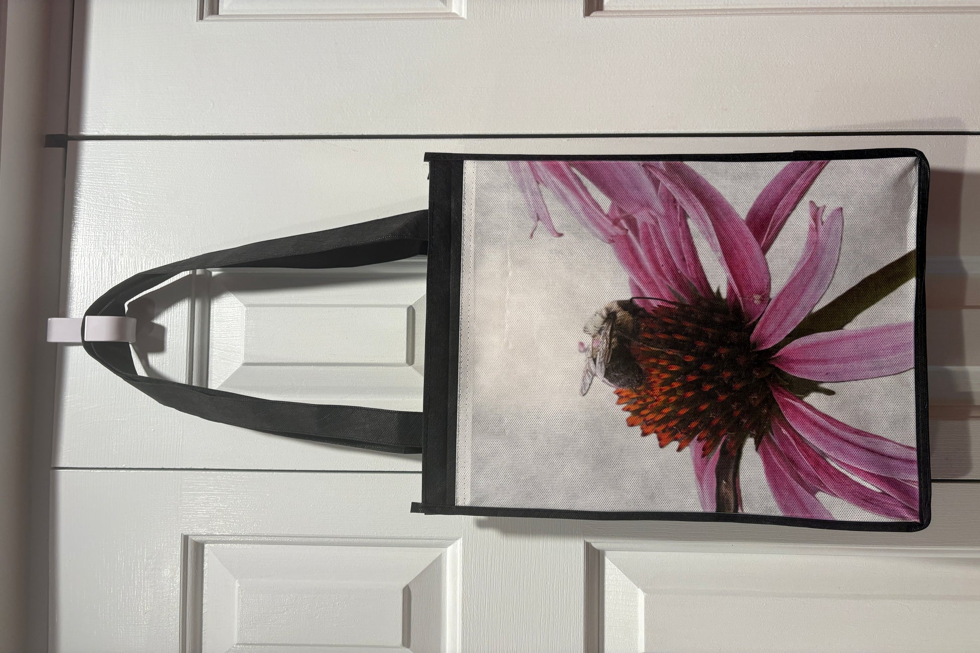 Description : Made 100% from recycled fibers, this rectangular tote keeps items standing straight so they won't fall over in transit. The size will easily accommodate two half gallons of milk or similar containers plus a few additional items. The blackberry lily garden, bee on a coneflower, and odd-shaped cherry tomato photos make these practical totes unique. Each bag is printed with the same image on both sides.