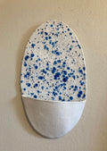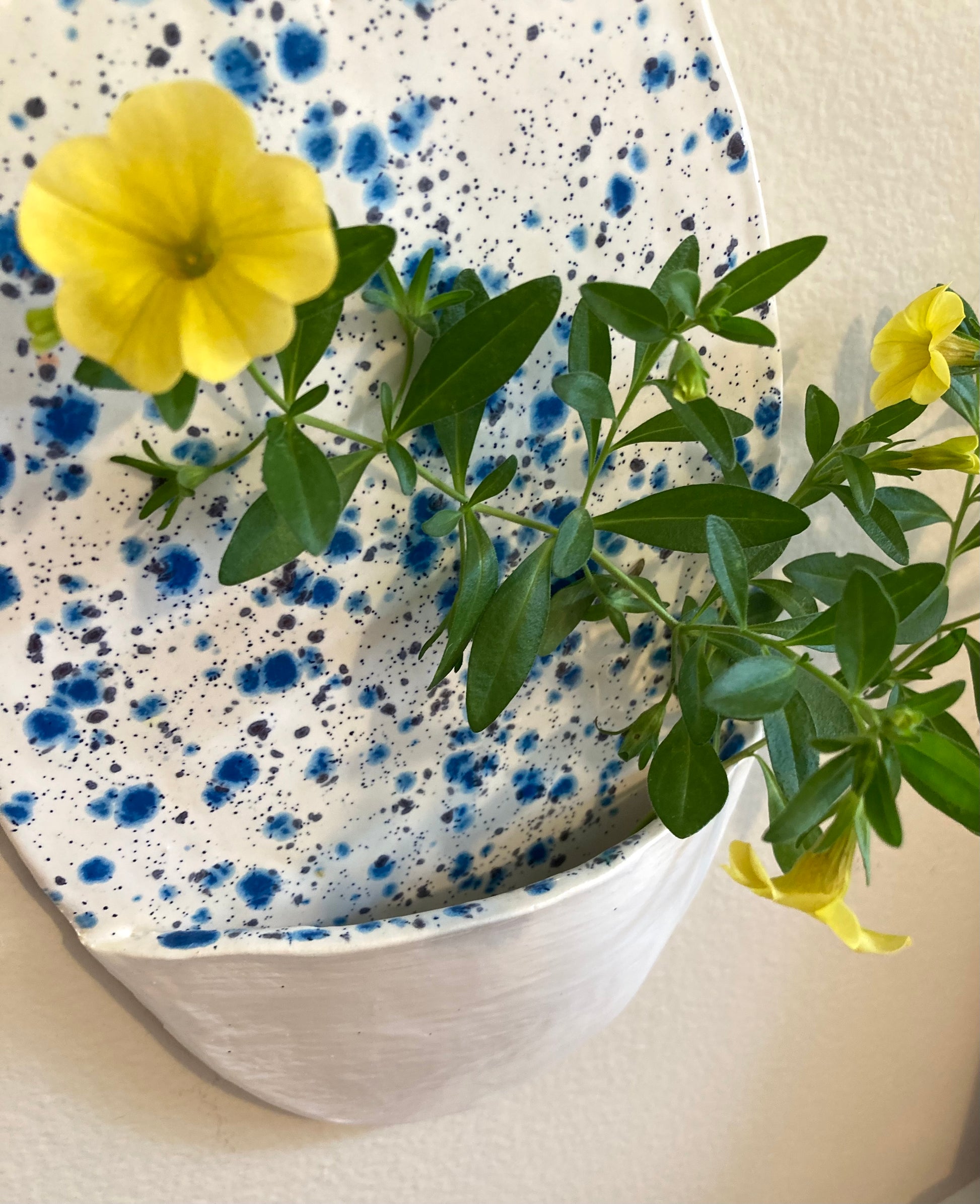 Description : Handmade ceramic wall pocket with a blue speckled glaze made to hold flowers or other trinkets of your choosing.