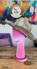 Description : Disco Cowboy Hat Silver Mirror Disco Cowboy Hat – Handmade Glam for the Spotlight Saddle up, sparkle lovers—your moment to shine has arrived. This medium-sized, adult-fit cowboy hat is the ultimate mashup of wild west flair and Studio 54 sparkle. Handcrafted with high-quality silver mirror tiles and a soft, durable polyester lining, it’s a head-turner that says “I came to slay”—without saying a word. Wrapped top-to-brim in gleaming mirrored tiles, this blinged-out beauty reflects light like a personal disco ball with a vendetta against boring. Whether you’re two-stepping into a theme party, lighting up a festival stage, or simply living your best glitter life on the dance floor, this hat delivers that deluxe drama with a side of yeehaw. Why you’ll love it: Handmade glam: Each mirror is lovingly placed by hand—because fabulous shouldn’t be factory-farmed. Unisex adult size: Fits most noggins with comfort and flair. Instant icon energy: Pair it with fringe, sequins, or just confidence. A lil’ heads-up: Due to its dazzling construction, the hat may experience slight pressure during travel (those mirror tiles are sensitive, darling). If anything arrives less-than-perfect, we’re here faster than a stagehand during a quick change. Drop us a message and we’ll make it right, stat. This isn’t just a hat. It’s a main character moment waiting to happen.
