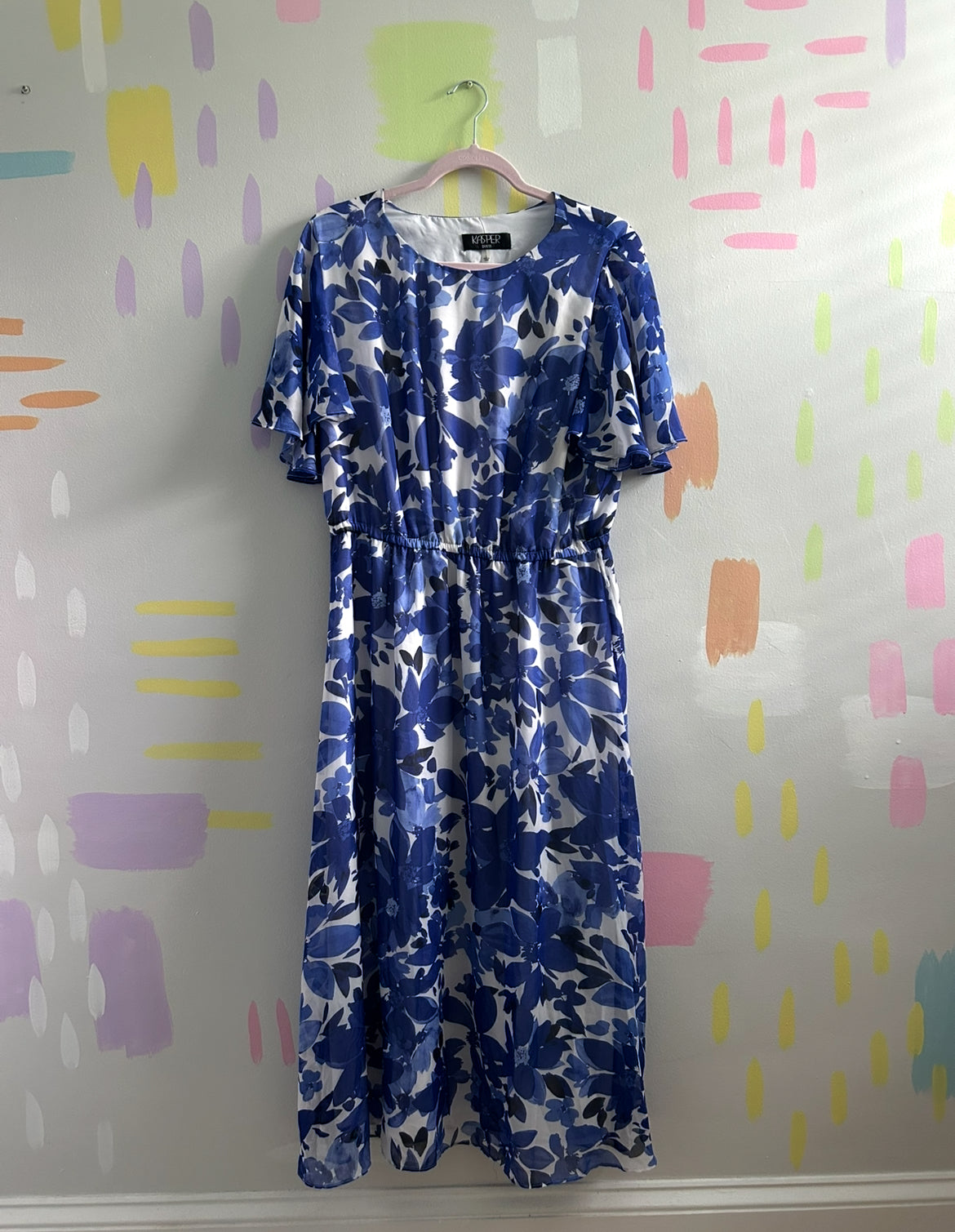 Description : Kasper Blue and White Floral Midi Dress - Size Large Step out in fresh, feminine style with this beautiful Kasper Blue and White Floral Midi Dress. This enchanting dress features a vibrant array of blue and white floral prints that dance across the fabric, creating a captivating and sophisticated look. Designed with a comfortable round neckline and delicate short flutter sleeves, this midi-length dress offers an elegant and airy feel. The elasticized waist cinches gently, providing a flattering silhouette while ensuring comfortable wear throughout the day. Perfect for a variety of occasions, from daytime gatherings and garden parties to casual evenings out, this Kasper dress effortlessly combines comfort and chic appeal. Key Features: Brand: Kasper Color: Shades of Blue and White Floral Print Style: Midi Dress Neckline: Round Neck Sleeves: Short Flutter Sleeves Waist: Elasticized Size: Large Lightweight and comfortable fabric Versatile for both casual and semi-formal events