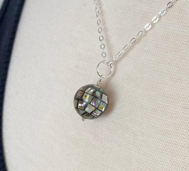 Description : Pretty black and white mother of pearl necklace in sterling silver. Pieces of black lip mother of pearl have been placed in a mosaic pattern on these 14mm smooth round beads, which sway on a sterling silver cable chain. 17" and finished with a sterling silver spring ring clasp.