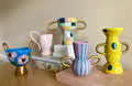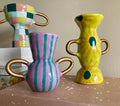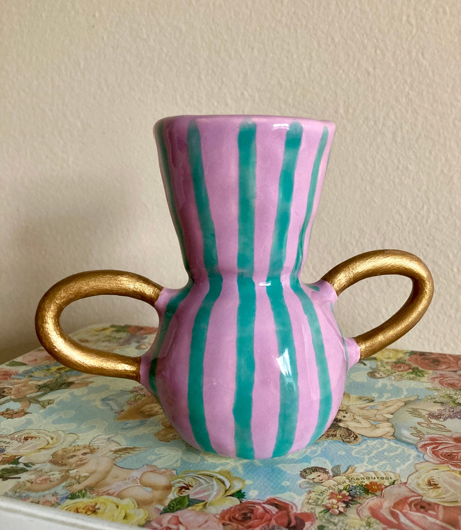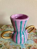 Description : Handmade ceramic vase with a purple and teal striped pattern and gold handles.