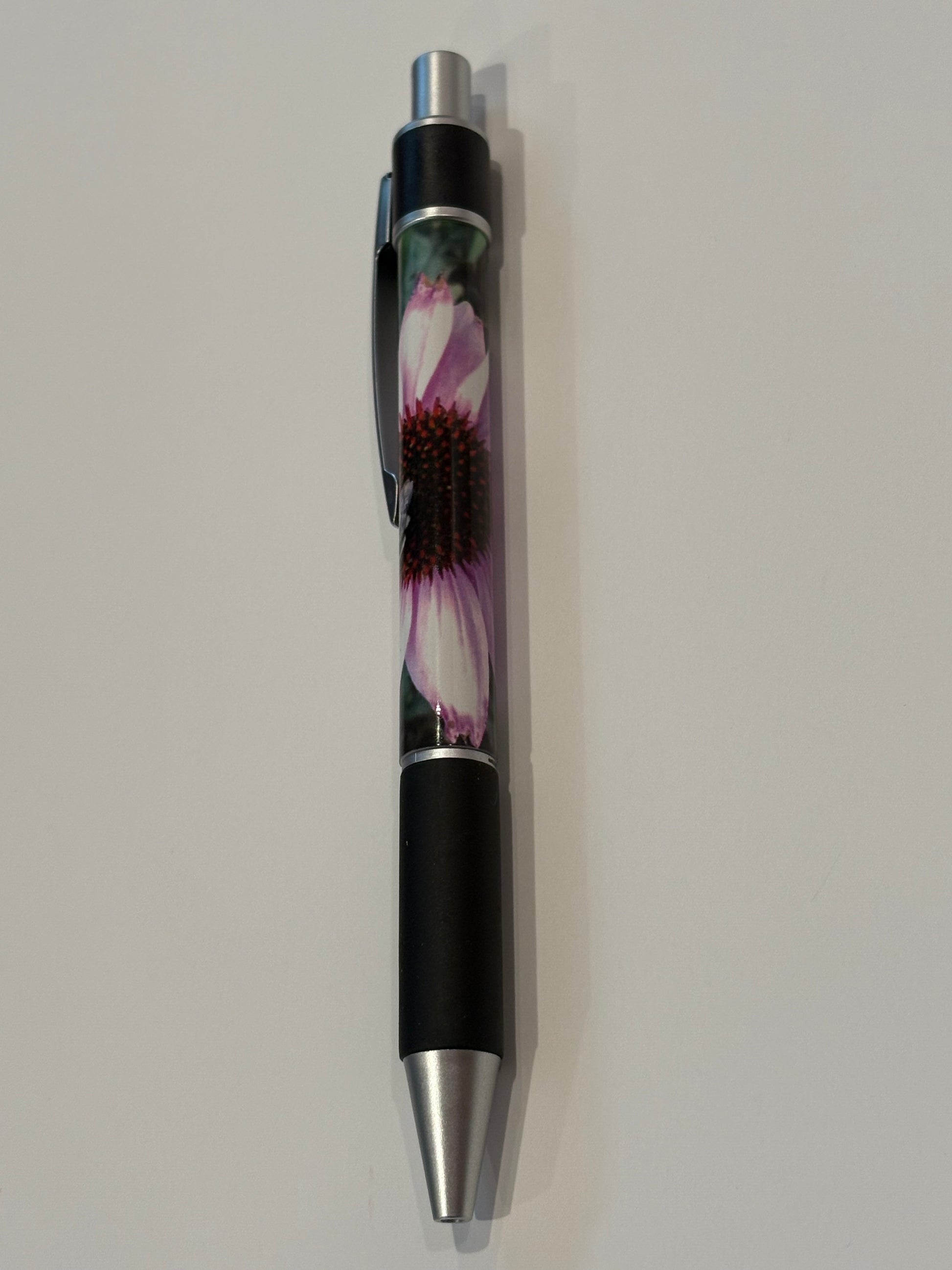 Description : Seldom will you find a specialty pen that features original art work. This Gift pen, offered in three different designs, writes well and bears the image from an original watercolor painting of a cone-flower in front of a weathered fence. Note cards and mugs with the same images are also available. You can almost smell the flowers!