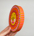Description : Painted Wooden Sun 5in circle 3/4in thick Hook on back for hanging Signed on back by Artist
